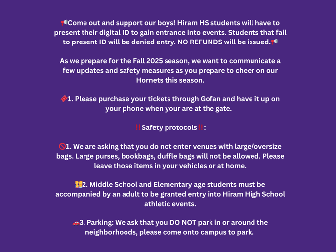 Skip Calendar Back To Full Month Choose View Month – Classic Month – List Week – Time Grid Week – List Week – Day Grid Day – List List – Upcoming Month – List with Image < > Event Title Starts Ends Get Directions Add To Calendar Important Information for Attendees to Hiram HS Athletic Events